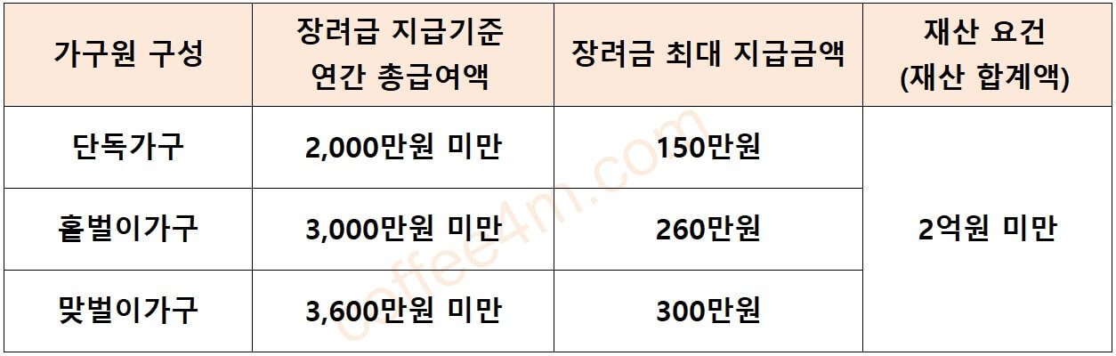 각 가구별 최대 장려금 지급금액은 각각 단독가구의 경우 최대 150만원, 홑벌이 가구의 경우 최대 260만원, 맞벌이 가구의 경우 최대 300만원입니다. 이것은 최대 금액입니다. 최대 금액은 아니더라도, 소득과 재산에 따라 어느 정도 받을 수 있습니다. 소득이 적다고 많이 받는 것이 아니라, 각 소득 구간별로 금액이 정해져 있다는 사실도 기억해 주시기 바랍니다.