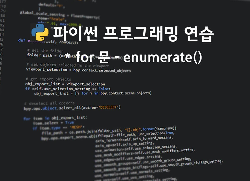이번 포스팅에서도 python for 문을 통해 컴퓨터에게 단순 반복 작업을 시키는 연습을 해보았습니다. python for 문은 for 변수 in 의 형태로 사용됩니다. in 뒤에는 리스트 [ ]나 range() 함수가 사용되는데, 리스트나 range() 대신 enumerate() 함수를 사용하면 인덱스까지 처리할 수 있습니다.